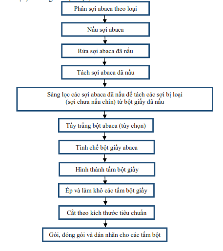 Sợi abaca (musa textilis) được chế biến thành bột giấy abaca thông qua quá trình làm bột giấy hóa cơ (tức là, kết hợp quá trình sản xuất cơ học và hóa học) thường trải qua quy trình sau: |
